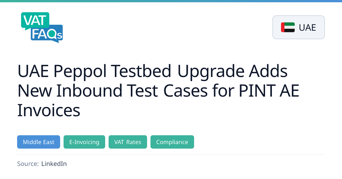 The UAE Peppol Testbed has been upgraded to support service providers preparing for accreditation. Two new inbound test cases – invalid PINT AE invoices due to Schematron and syntax errors – have been added, along with an updated UAE Tax Data Document (TDD) version 1.0.1. Service providers must return a negative Message Level Response and submit a UAE Tax Data Status (TDS) to the Federal Tax Authority Access Point.