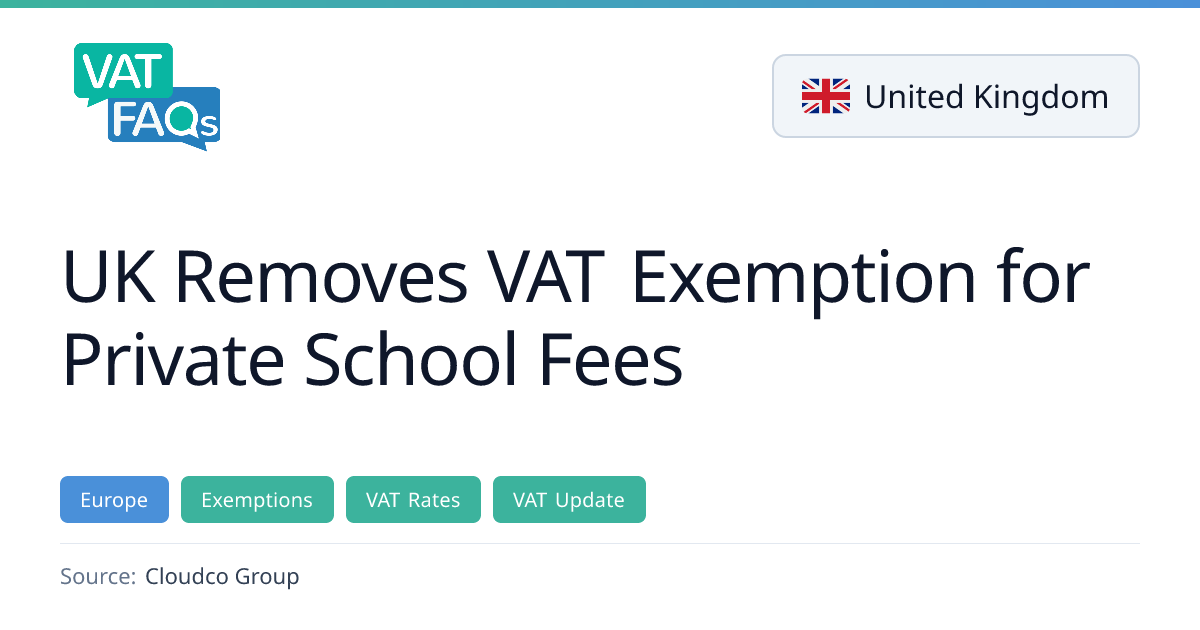 From 1 January 2025, the UK's long-standing VAT exemption for private education was removed. Private schools must now charge 20% VAT on their fees, significantly impacting the independent education sector.
