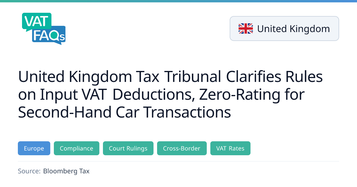 The UK First‑Tier Tax Tribunal issued a judgment on Jan. 9 clarifying input VAT deduction and zero‑rating rules for second‑hand car transactions. The case involved a company that purchased high‑value used cars in Northern Ireland and sold them to customers in the Republic of Ireland. The Tribunal found that the taxpayer could not claim the input VAT deduction and zero‑rating as the Tax Agency had denied the claims.