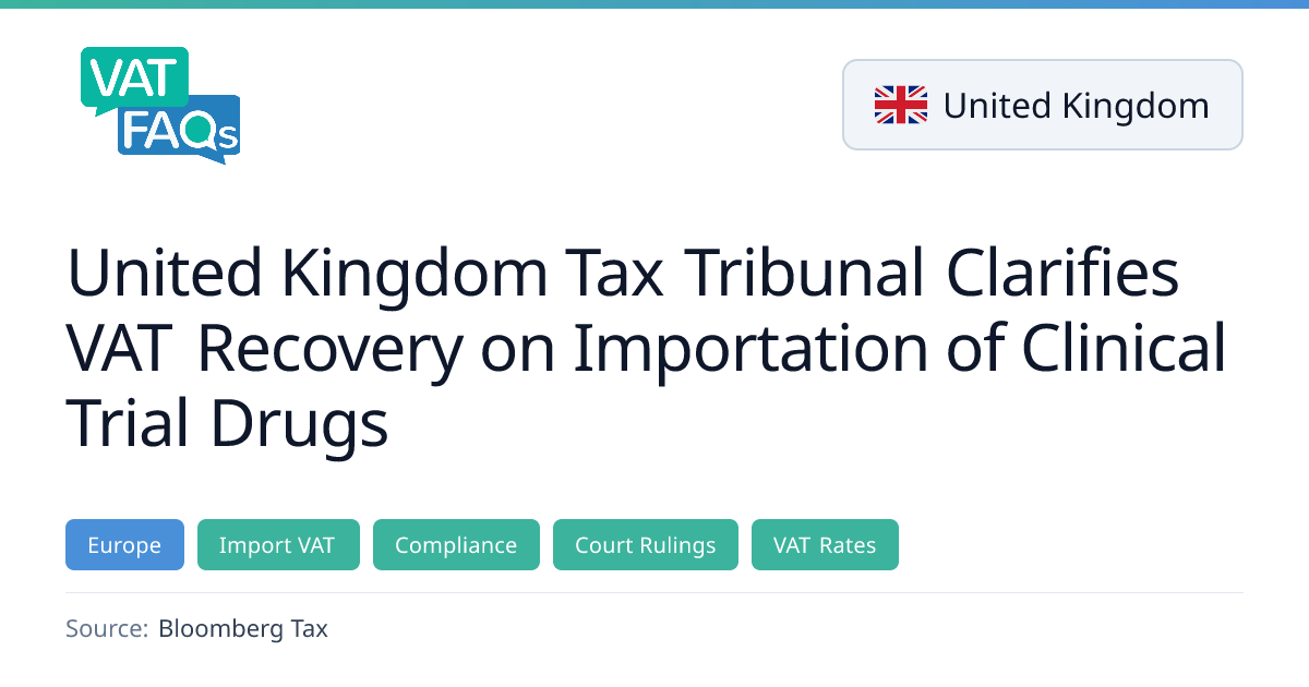 The UK First‑Tier Tribunal clarified that a logistics provider acting as an agent in its own name can recover import VAT on clinical trial drugs, overturning HMRC’s earlier denial. The tribunal held that the taxpayer’s lack of ownership and supply for consideration did not preclude input‑VAT treatment. The decision, case No. TC09749, was issued on 14 January 2026.