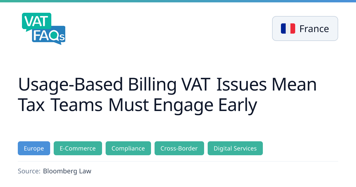 The article explains how usage‑based billing models—common in AI and SaaS—create complex VAT timing issues. It outlines when VAT is due for prepaid credits, hybrid pricing, tiered discounts, and the risks of delayed data processing. Tax teams are urged to embed VAT rules into billing workflows early to avoid compliance gaps.