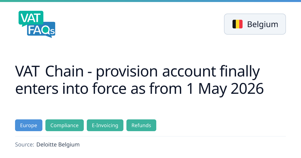 Belgium’s VAT chain reform introduces a new VAT provision account effective 1 May 2026, replacing the current account and changing account numbers. The summer regime for late filing will be abolished, and taxpayers can request historic VAT credits via MyMinfin. Key dates are 30 April 2026 for return submission and 1 May 2026 for the new account and credit transfer.