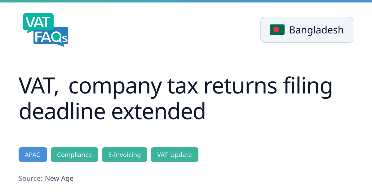 The National Board of Revenue (NBR) in Bangladesh has extended the filing deadline for corporate income tax returns for the 2025-26 tax year to April 15, 2026, and the deadline for online VAT returns for February 2026 to March 29, 2026. The extensions were announced to accommodate business requests and to address technical congestion and system latency caused by recent public holidays.
