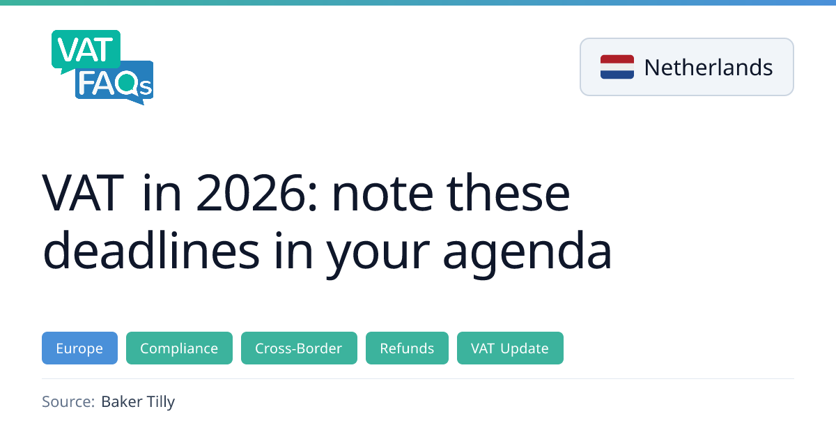 Baker Tilly outlines the key filing and payment deadlines for Dutch VAT returns in 2026, including special rules for months that fall on weekends, annual returns for small income‑tax entrepreneurs, and new requirements for supplementary returns and foreign VAT refunds. The article also highlights 2026 changes such as the abolition of the low lodging rate and new review periods for large real‑estate investments.