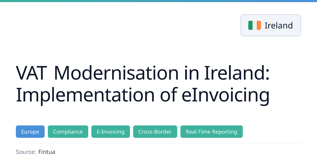 Fintua’s blog post reviews Ireland’s upcoming e‑invoicing mandate under the EU’s Digital Reporting Requirements, outlining the phased implementation schedule and the planned adoption of Peppol. It highlights the 10‑day invoicing window, the 2030 compliance deadline, and the role of AI in ensuring data quality. The piece serves as a practical guide for Irish businesses preparing for the new digital VAT regime.