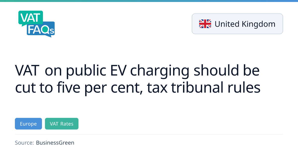 A UK tribunal ruled that community public charging supplies qualify for the 5% reduced VAT rate under the de minimis provision, overturning HMRC's earlier 20% requirement. The ruling applies to supplies below 1,000 kWh per month per customer at each location and is limited to operators meeting the community‑based model. The decision could influence VAT treatment for other public charging operators.