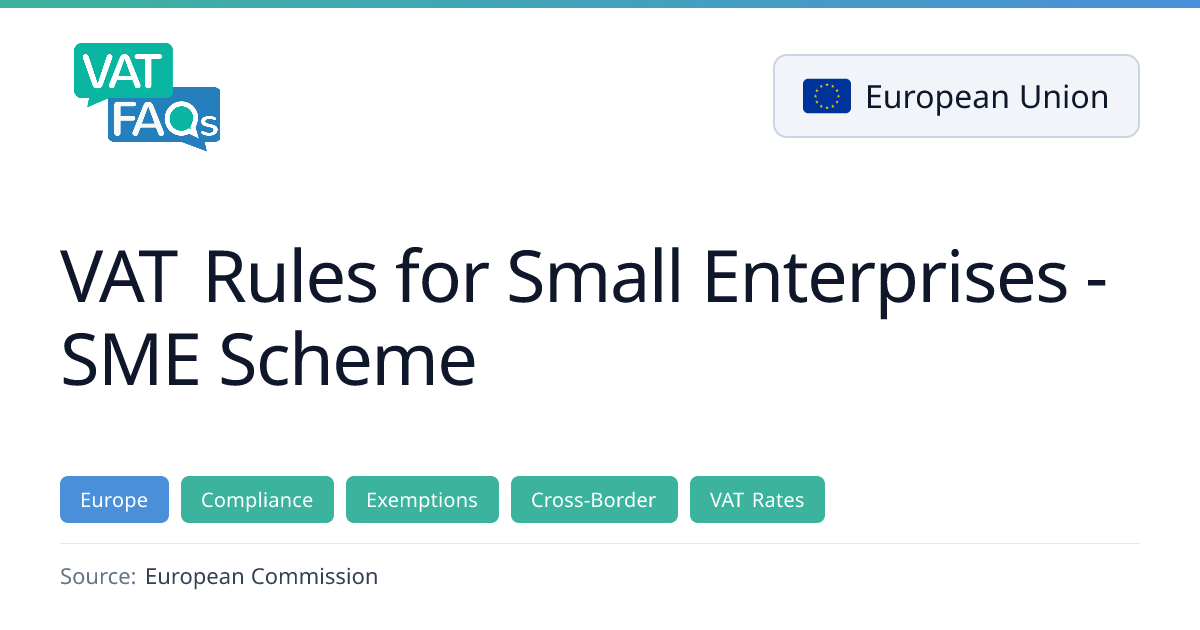 The SME scheme allows small enterprises to sell goods and services without charging VAT to their customers and alleviates their VAT compliance obligations. The scheme is optional and applicable to small enterprises with a total annual turnover of no more than EUR 100,000 in all Member States.