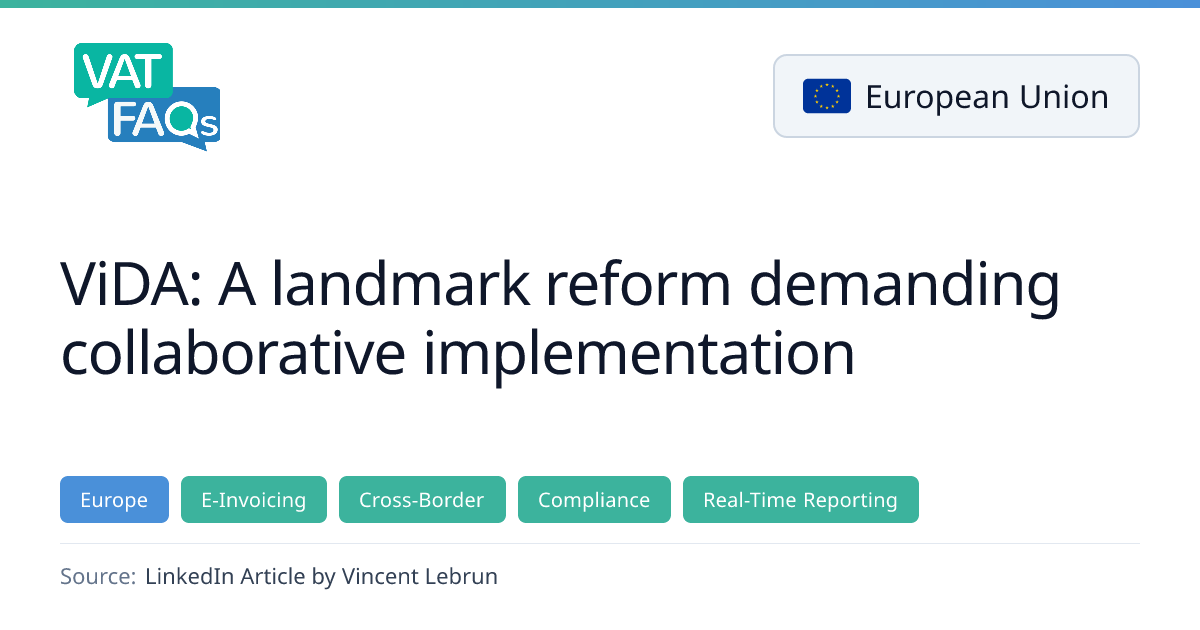 The ViDA package represents a sweeping overhaul of the EU VAT system, aiming to curb fraud, simplify SME compliance, and create a fairer digital marketplace. It introduces mandatory e‑invoicing and near real‑time digital reporting for intra‑EU transactions, expands the Single VAT Registration and Import One‑Stop Shop, and projects up to €18 billion in annual revenue gains and €5.1 billion in compliance cost reductions by 2030.