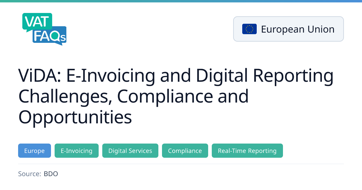 The European Parliament’s ViDA package introduces mandatory e‑invoicing and near real‑time digital reporting for cross‑border EU transactions from 1 July 2030, requiring the EU electronic invoicing format. Businesses must report transaction data within 10 days of the taxable event, and member states may extend domestic e‑invoicing to before, on, or after that date with transitional periods up to 2035. The initiative aims to harmonise VAT rules, reduce fraud, and lower compliance costs across the EU.