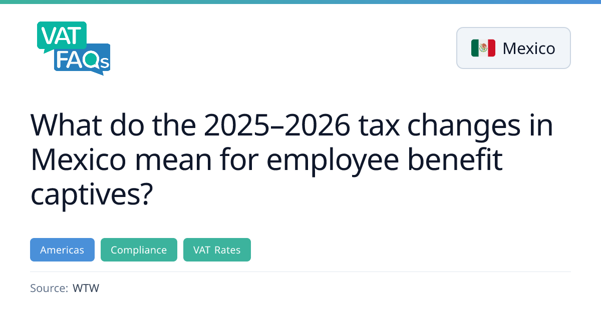 Mexico amended its Federal Revenue Law on 7 November 2025, removing the ability to recover 16% VAT on goods and services used in major medical insurance claims. The change is retroactive from 1 January 2025 and is expected to raise major medical costs by 10‑12%, potentially increasing loss ratios by 8‑12% and overall captive costs by over 20%. WTW recommends early engagement and scenario analysis to manage the impact.