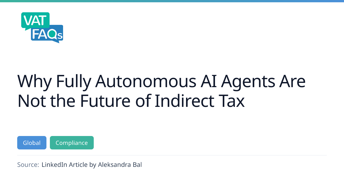 The article argues that fully autonomous AI agents will not replace tax professionals in indirect tax due to reliability constraints and the need for structured workflows. It emphasizes that progress comes from workflow design rather than model capability, and that AI agents should be used as supervised assistants to coordinate multi‑step processes. The future will see narrow, supervised agents complementing deterministic tax engines rather than replacing them.