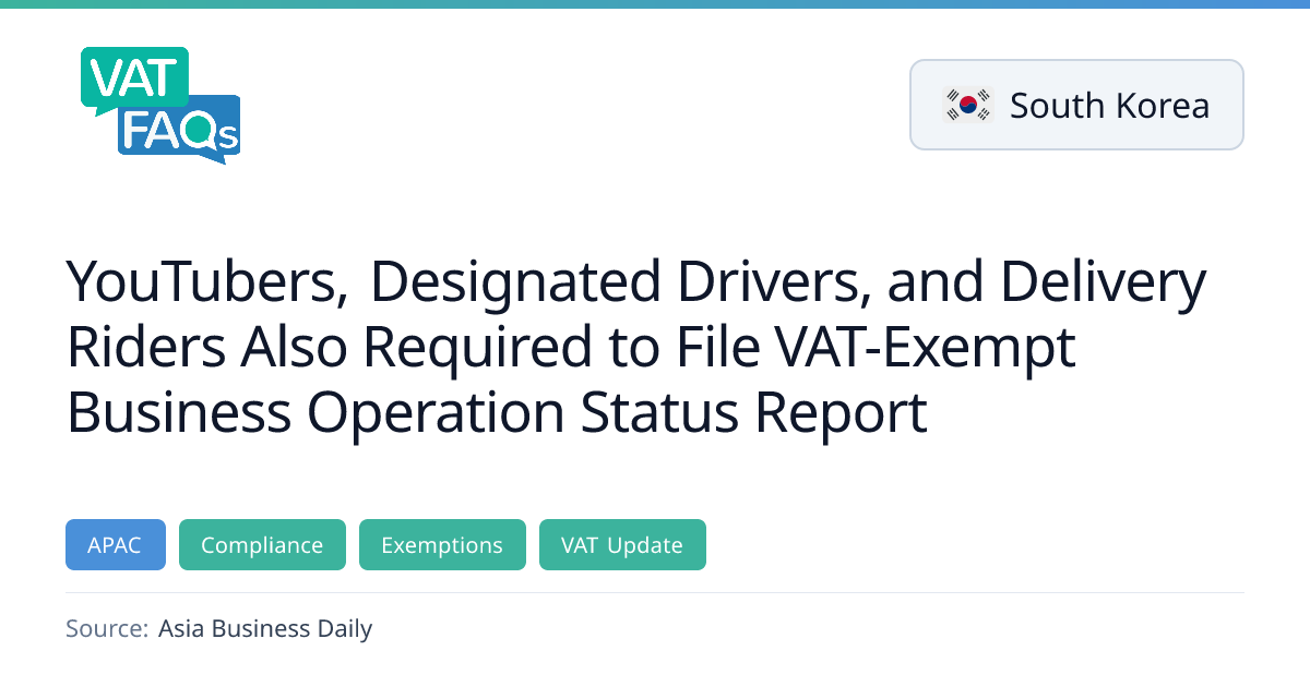 South Korea’s National Tax Service has introduced a new filing requirement for VAT‑exempt business owners, including YouTubers, drivers, and delivery riders. All such owners must submit an annual business operation status report by February 10, 2025, and will receive mobile notifications starting on the 21st of the reporting month. The rule expands guidance to one‑person media creators and sets a 24 million won income threshold for certain personal service providers.